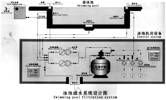 泳池回水從主回水格柵先經毛發聚集器,循環泵將水中毛發、大的懸浮物截留住,以免毛發纏繞泵的葉輪,影響后繼設備運行。出水加入混凝劑后,在管道內發生混合反應,將水中微小懸浮物凝聚,產生花經高速過濾器后襯過濾截留。后經過換熱器,池水部分加熱后,與另一部分混合。此時加入消毒劑,以殺滅水中細菌,保持一定的余氯量,并加入除藻劑,避免池水發綠,并調節PH值,然后池水重新回到泳池。以上是成熟的游泳池循環水處理工藝。
