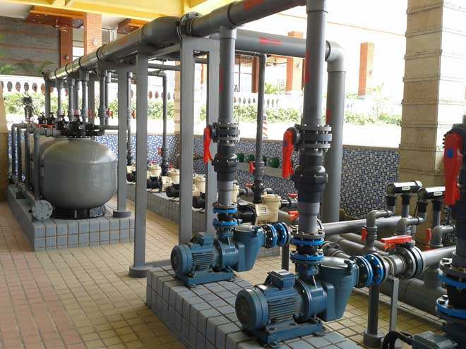 傳統機房沙缸水泵設備適用于比較大型的游泳池,如標準池、水上樂園等,它需要大量的管道、需要建設機房,施工過程和耗時也會非常的長.