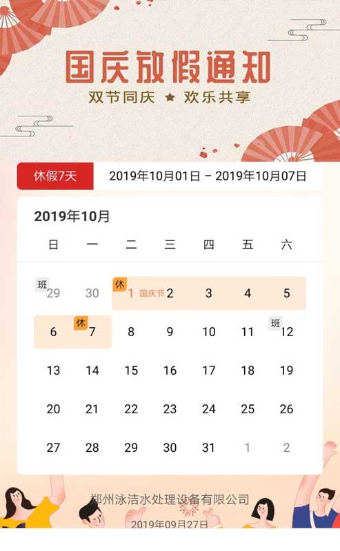 其次,鄭州泳潔國慶放假通知: