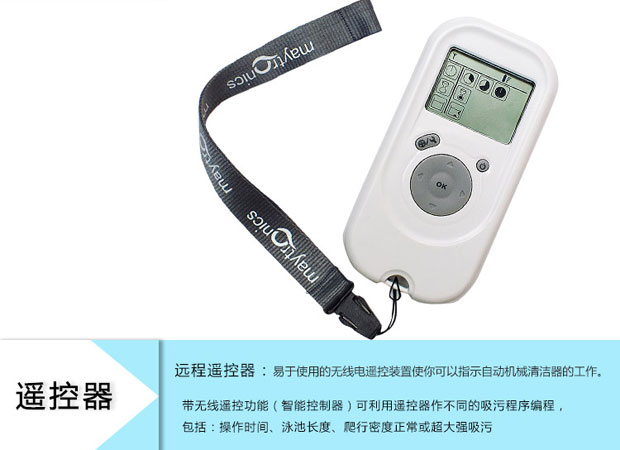 2、可利用遙控器作不同的吸污程序編程,包括:操作時間、泳池長度、爬行密度正常或超大強吸污等等。
